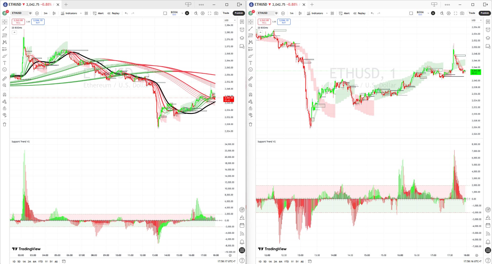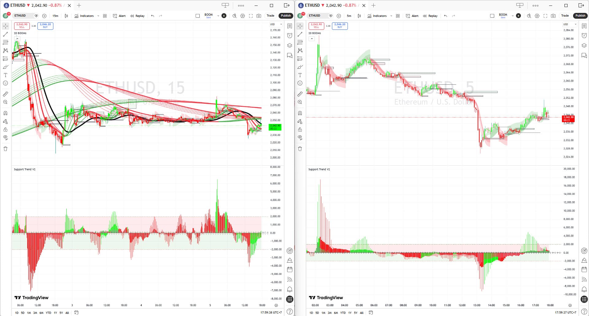 | Support Trend V2 | บอกพลังของทิศทางนั้น | ค่าตัวเลข ±2000, สีเส้น, แท่ง VABO |